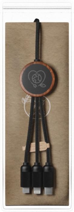 Cable de carga 3 en 1 extendido de PET reciclado con logotipo retroiluminado y estuche redondo de bambú. El logotipo retroiluminado es visible por ambos lados. Cuenta con 3 conectores (tipo C, micro USB, iPhone) y un conector USB doble para uso universal. Se entrega en una funda de TPU, con una tarjeta de papel kraft. Longitud del cable: 1 metro. Incluye una garantía de tres años.Ref. 2PX08471