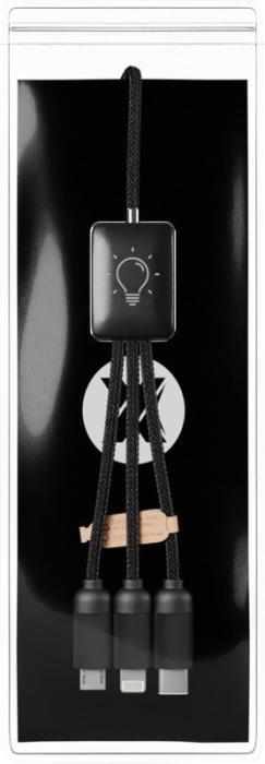 Cable de carga con acabado de caucho y metal y logotipo luminoso. Equipado con tres conectores (tipo C, Android, iPhone) y salida USB A y USB C. Se pueden cargar hasta tres dispositivos simultáneamente. Longitud de los cables (incluidos los conectores): 10 cm. Longitud total del cable: 1 metro. El cable está fabricado con plástico PET reciclado, y el embalaje con papel y plástico reciclados.Ref. 2PX06421