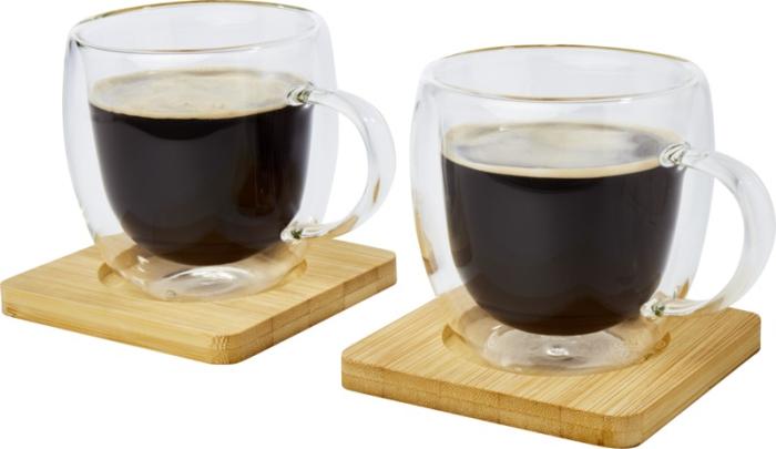 Dos tazas de vidrio de doble pared de 250 ml con posavasos de bambú “Manti”