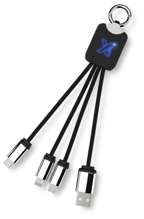 Cable de carga con logotipo retroiluminado con acabado de goma y metal provisto de tres conectores (tipo C, Android y iPhone). Se pueden cargar hasta tres dispositivos simultáneamente. Longitud de los cables (incluidos los conectores): 10 cm. Longitud total del cable: 1 metro. El embalaje está fabricado con papel reciclado y el cable RPET en plástico reciclado.Ref. 2PX00121