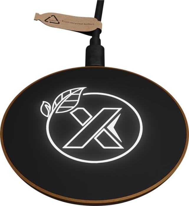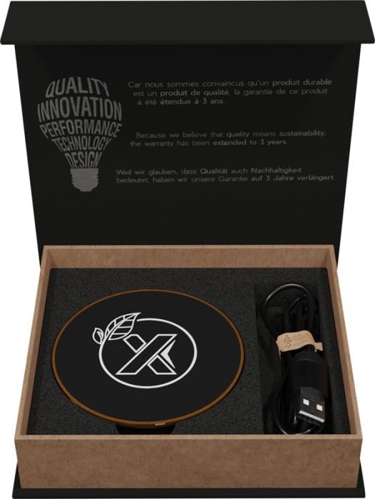 Estación de carga inalámbrica de 10 W hecha de goma y madera , con un cable de carga hecho de PET. Se puede decorar con un logotipo retroiluminado. Se entrega en una caja de regalo de papel kraft negro con mecanismo de cierre magnético. Patente EUROPA EUIPO.Ref. 2PX05171